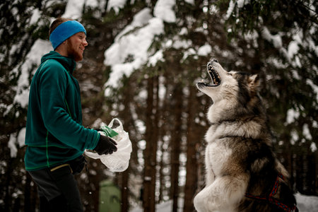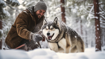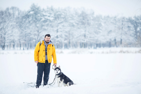 Man walking with dog winter time with snow in forest Malamute and Huskies friendship. Outdoor.