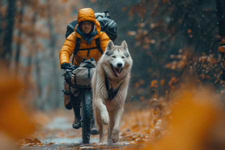 Senior musher wearing winter clothes is smiling next to his Alaskan husky dog in a snowy forest