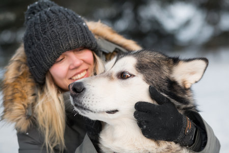 Smiling woman embracing alaskan malamute with love in winter forest . close up.