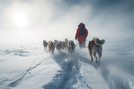 Frozen journey, person with sled of dogs traverses snowy antarctica, an epic adventure through icy landscapes with loyal canine companions, exploring the remote and pristine wildernes.