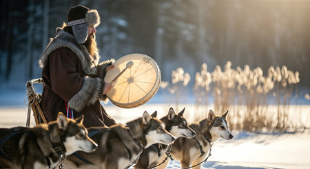 Man in traditional clothing plays a drum while sled dogs stand in a snowy environment, illustrating cultural practices and the bond with nature
