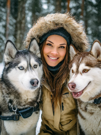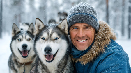 Man posing with husky next to other sled dogs in snowy forest enjoying friendship