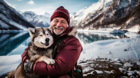 An elderly man tourist hugs a dog against the backdrop of a winter forest and mountains.