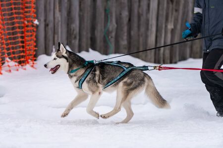 Running Husky dog on sled dog racing. Winter dog sport sled team competition. Siberian husky dog in harness pull skier or sled with musher. Active running on snowy cross country track road