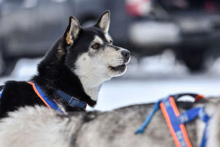 Husky dog outdoor, winter background. Funny pet on walking before sled dog racing.