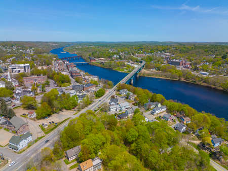 Memorial Bridge aerial view over Kennebec River in historic downtown of Augusta, Maine ME, USA.