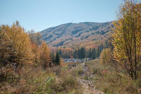 Autumn mountain landscape with colorful forest and road on a sunny day. Trail in Stoneham Mountain, Quebec, Canada.