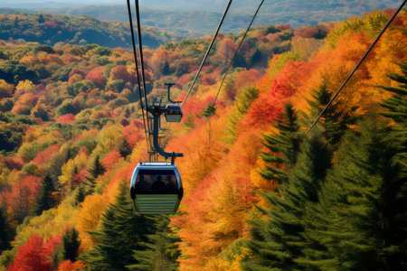 Cable car view. Fall colour seen from above, with telephoto lens, on Stowe Mountains in Vermont, US. A forest of trees turning red and orange.
