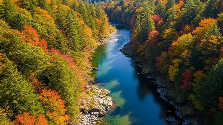 An aerial perspective reveals a winding river flowing through a dense forest ablaze with the vibrant colors of autumn. The trees display a spectrum of red, orange, yellow, and green foliage, creating a rich and textured canopy. The river's surface reflects the colorful surroundings, adding to the picturesque and serene beauty of this natural landscape. The scene evokes a sense of untouched wilderness and seasonal splendor.
