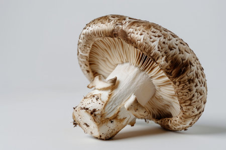 A minimalistic photo of a mushroom cut in half to reveal its interior, set against a plain white background for a clean and straightforward look.