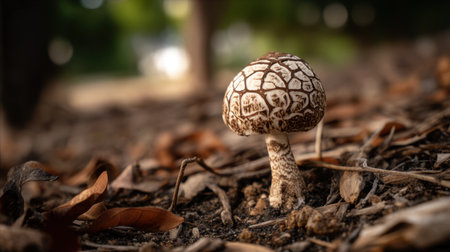 This image features a close-up view of a unique mushroom with intricate patterns, nestled among soft soil and fallen leaves, showcasing nature's beauty.