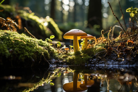 Mushrooms growing in a forest, bathed in the soft light of sunrise, creating a serene and magical atmosphere. Ideal for themes of nature, forests, and tranquility.