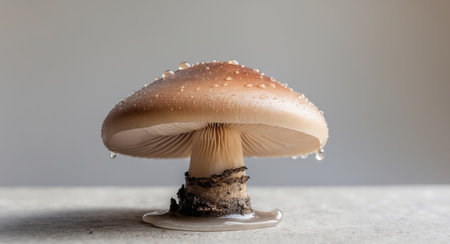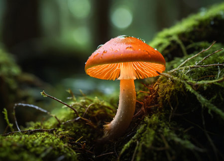 A stunning close-up of a glowing mushroom adorned with dew drops. This enchanting forest scene captures the beauty of nature and tranquility.