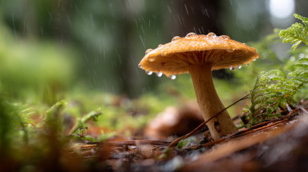 A stunning close-up of a rain-soaked mushroom displaying glistening water droplets, surrounded by vibrant greenery in a serene forest setting.
