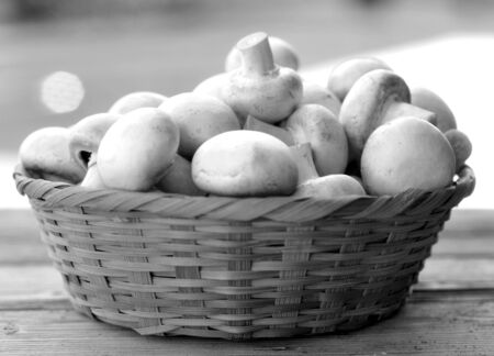 Vegetarian food. Fresh white mushrooms champigonons on wooden kitchen table as background.