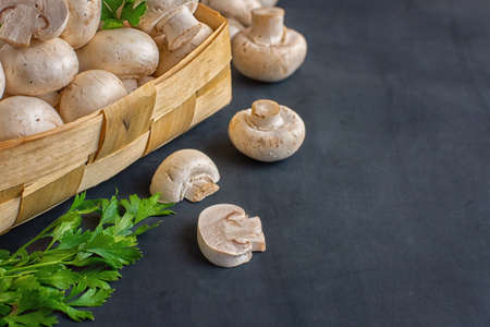 Set of fresh whole and sliced champignon mushrooms in a basket on a dark background.