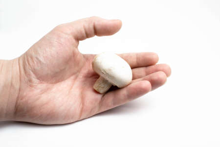 Fresh raw white Champignon mushroom held by Caucasian male hand. Close up studio shot, isolated on blue background.
