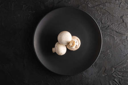 Three champignon mushrooms healthy food on black plate on dark black textured background, top view