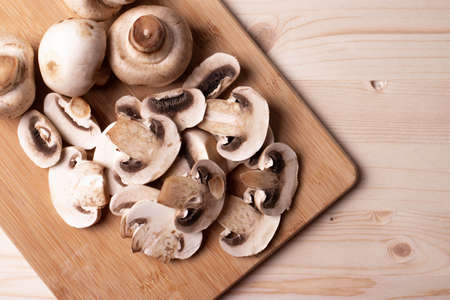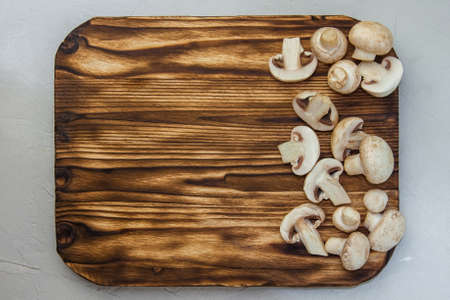 Raw sliced mushrooms . Vegetarian food. Group of organic mushrooms on wooden board. copy space.