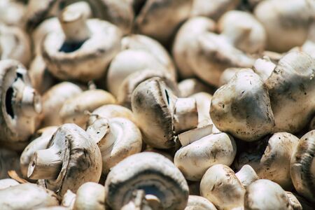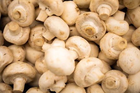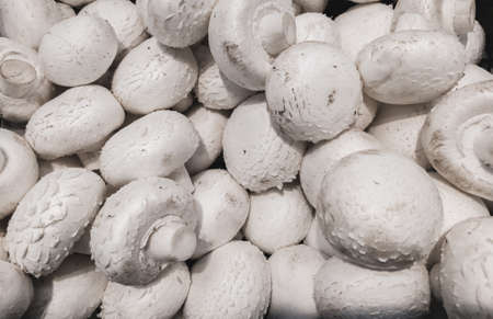 Background from a variety of white champignon mushrooms. Mushroom texture.