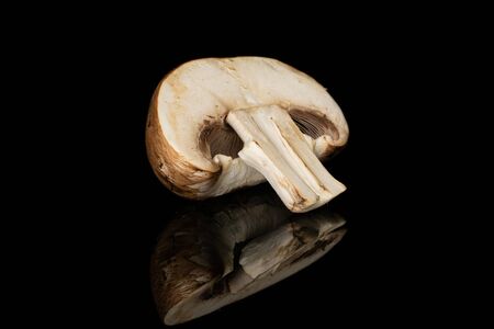 Mushrooms champignons on a black mirror surface isolated on black background.