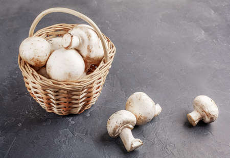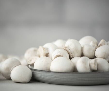 Mushrooms lies on a gray background. Champignons photographed at close range. . High quality photo