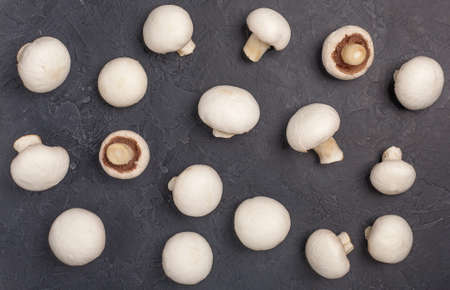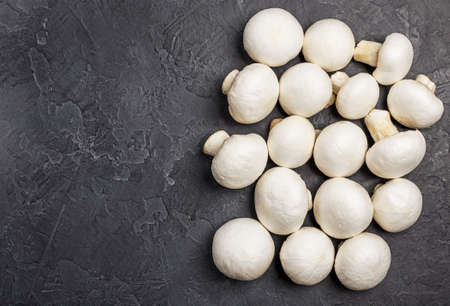 Mushrooms on black stone surface. Top view, copy space. Fresh raw champignon with a brown cap on dark background.