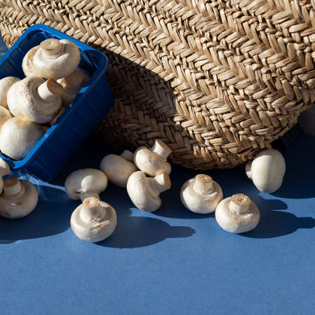 Champignon mushrooms in an eco-bag on a blue background with copy space. Side view
