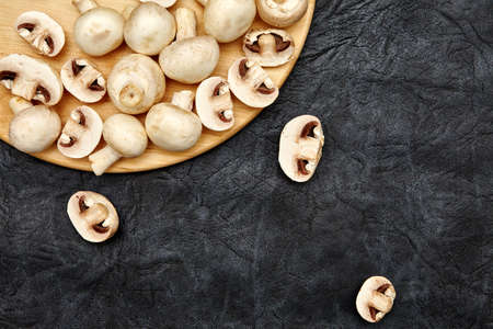 Fresh champignon mushrooms on dark background, sliced and whole, ready for cooking. Top view, copy space.