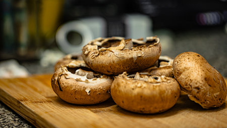 Whole raw fresh cultivated brown mushrooms, also known as champignons, on a wooden cutting board close-up.