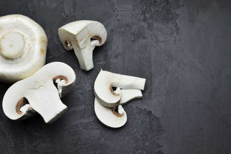 A half of mushrooms on a black background. Champignons on a black background. Whole and chopped mushrooms on a dark background. Top view. Space for text.