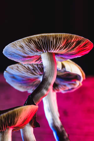The Mexican magic mushroom is a psilocybe cubensis, a specie of psychedelic mushroom whose main active elements are psilocybin and psilocin - Mexican Psilocybe Cubensis. An adult mushroom raining spores. red and blue color. vertical orientation