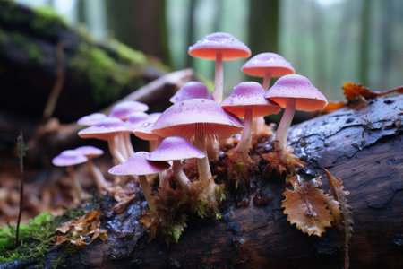 group of psychedelic mushrooms growing on a decaying log, created with generative ai