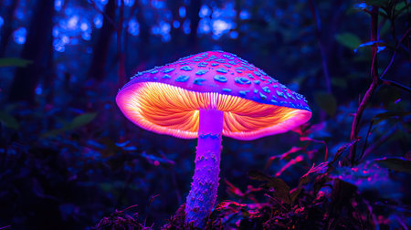 A stunning scene of a vibrant mushroom glowing with neon colors in a mystical forest. The enchanting atmosphere is enhanced by soft light and moisture.