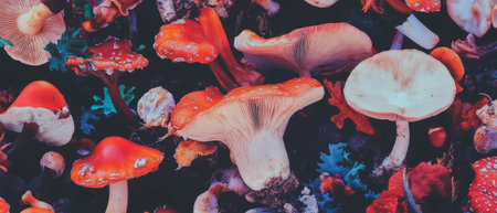 Mushrooms thrive on rich soil with varied textures and colors in natures habitat
