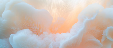 Extreme close up of mushrooms in the rays of the sun. Macro photo of lamellar lower part of the mushroom. Part of the hymenophore with wavy plates. Golden abstract background. Generative AI.