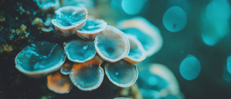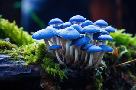 Intriguing Blue mushroom closeup background. Water glow. Generate Ai