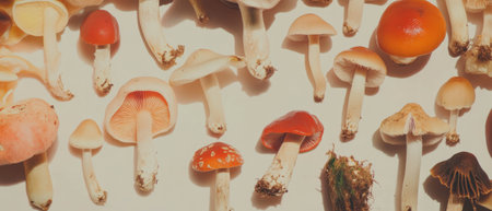 Fascinating textures and shapes of various mushrooms on a neutral background