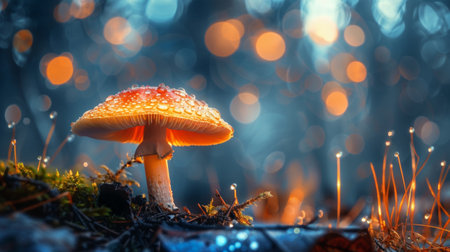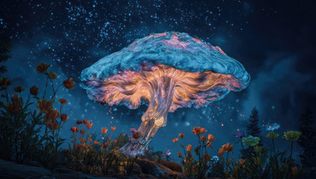 An illuminated mushroom takes center stage in this fantastical image. It showcases a blend of vibrant colors and textures under a night sky filled with stars. The image employs unique lighting, creating a captivating visual. Suitable for illustrations and editorial content, it lends itself well to artistic and creative applications.