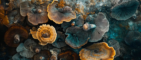 Close up view of colorful mushrooms showcasing intricate textures and patterns, emphasizing earthy tones and organic forms in a natural setting
