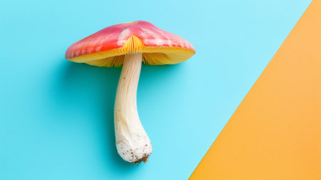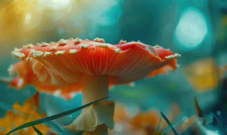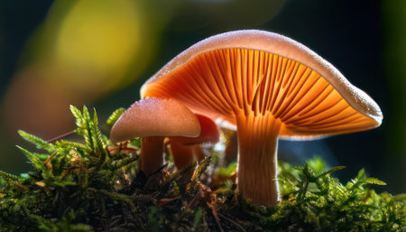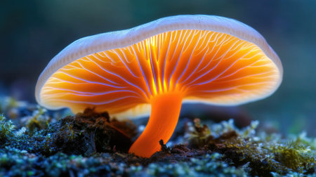 A stunning close-up of a vibrant mushroom showcasing its glowing gills. This colorful fungus highlights the beauty of nature in a serene forest setting, perfect for nature lovers and biology enthusiasts.