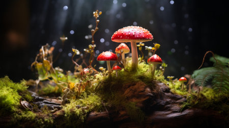 a cluster of red toadstools against a mossy forest floor, created with generative ai