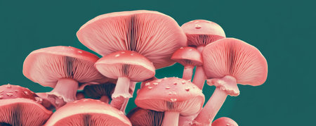 Pink mushrooms against a teal background, artistic close-up. Nature and fungi concept