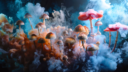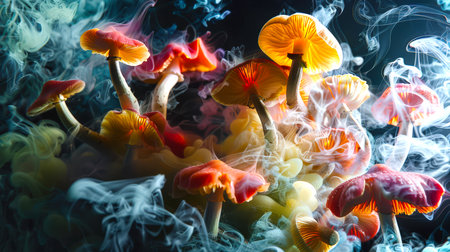 A clearing of various toadstools in colorful mystical stylish smoke on a black background. Shamanic narcotic trip. The mood of the painting is surreal, smoke and mushrooms create an atmosphere of the other world. Psilocybin mushrooms. Euphoria