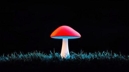 A striking image of a red mushroom with a white stem, set against a black backdrop with illuminated grass.