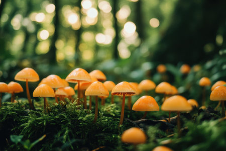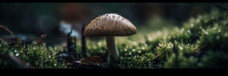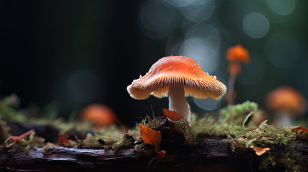 A close up of a mushroom on a moss covered ground. Generative AI image.