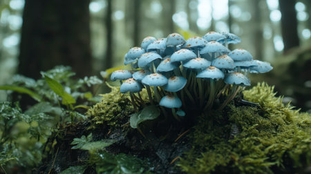 Clusters of blue mushrooms emerge from the moss in a tranquil forest, surrounded by greenery and gentle light filtering through the trees.