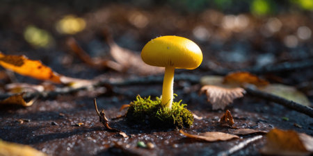 AI Generated. A tight shot of a tiny yellow mushroom in the forest