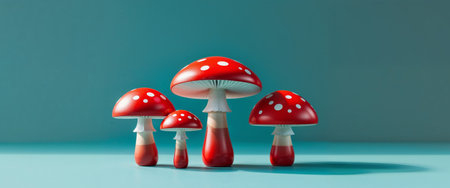 AI Generated. Colorful wooden mushrooms with red caps and white spots on a teal background