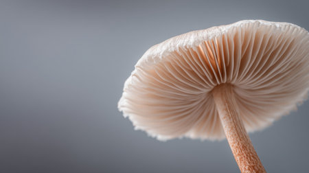 This striking close-up image showcases the intricate details of a mushroom cap, highlighting its delicate gills and soft texture against a muted gray backdrop.
